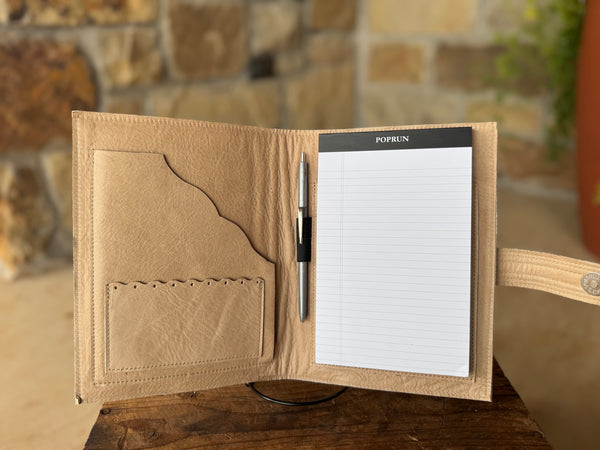 The cutest western notepad! Handmade, genuine leather, with a magnetic closure. Notepad slot fits 5x8 mini legal pad, one large side slot, and one small card pocket. Made in Oklahoma