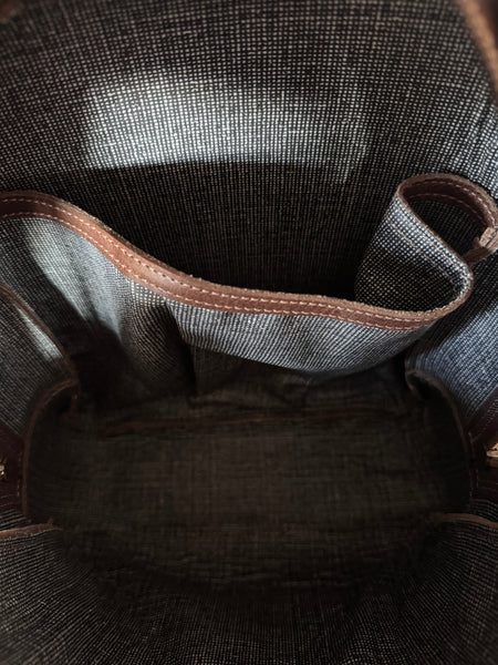 The handiest little backpack ever! Genuine leather, hairhide and Pendleton front pocket. Key ring loop on side with detachable keychain. Lined with laminated cotton makes cleaning up a breeze!